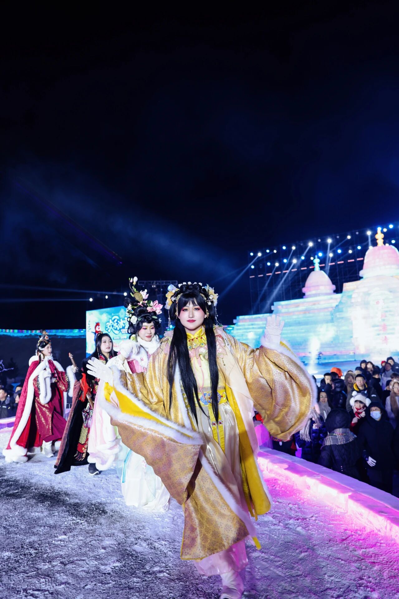 本届冰雪节创新实现“一园双景、昼夜同辉”:日间为晶莹剔透的冰雪王国,入夜则化身为流光溢彩的灯影幻境。以“花木兰”“王昭君”为主题、高达12米的非遗自贡主灯组,与“万马奔腾”“山海仙阙”“宫灯长卷”等二十余组灯阵共同构建出宏大而瑰丽的仙侠叙事空间。